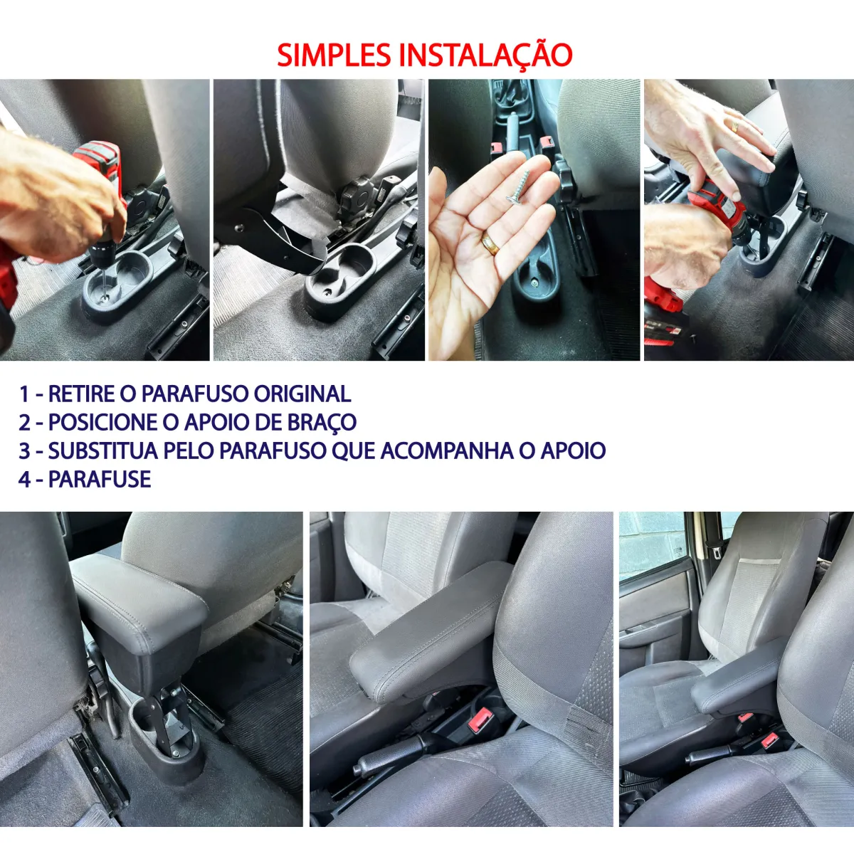 SIMPLES INSTALAÇÃO: 1- Retire o parafuso original 2- Posicione o apoio de braço 3- Substitua pelo parafuso que acompanha o apoio 4- Parafuse